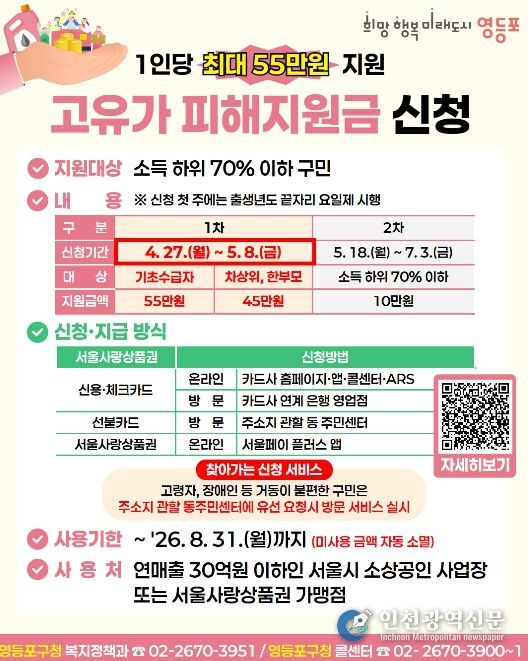 [인천광역신문] 최예준 기자 | 영등포구가 계속되는 고유가 상황 속에서 구민들의 경제적 부담을 완화하기 위해 ‘고유가 피해지원금’ 지급에 나선다고 밝혔다. 이번 지원금은 2026년 3월 30일을 기점으로 소득하위 70% 이하인 구민을 대상으로 하며, 소득 수준에 따라 차등 지급된다.