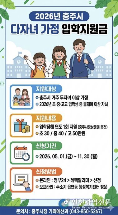 [인천광역신문] 최예준 기자 | 충주시는 다자녀 가정의 경제적 부담을 완화하고 안정적인 양육 환경을 조성하기 위해 2026학년도 초·중·고등학교에 입학하는 둘째 자녀 이상에게 입학지원금을 지원한다고 밝혔다.