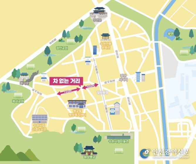 [인천광역신문] 최예준 기자 | 수원시 행궁동 화서문로 34번지부터 신풍로 47번지까지 약 220m 구간이 5월부터 매주 토요일 ‘차 없는 거리’로 운영된다.