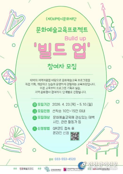 [인천광역신문] 최예준 기자 | (재)태백시문화재단은 지역 문화예술교육 인력 양성과 지속 가능한 문화예술 생태계 조성을 위해 '2026 태백 문화예술교육 프로젝트 ‘빌드 업(Build up)’' 참여자를 모집한다.