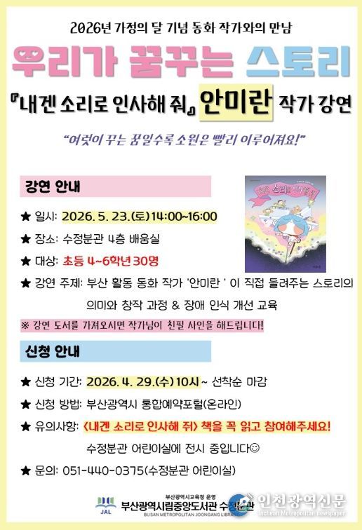 [인천광역신문] 최예준 기자 | 부산광역시립중앙도서관은 다음달 23일 중앙도서관 수정분관에서 초등학생 4~6학년 30명을 대상으로 가정의달 기념 안미란 동화 작가와의 만남 ‘우리가 꿈꾸는 스토리’를 운영한다.