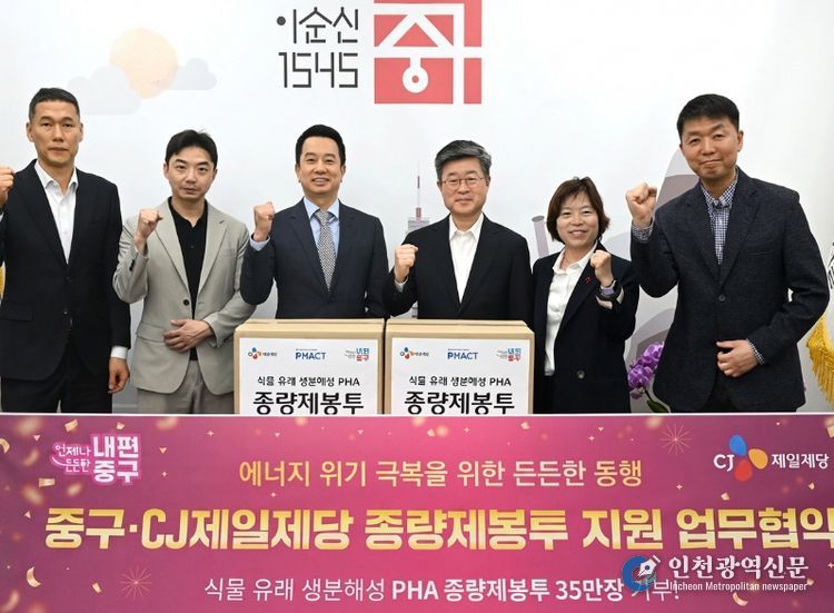 [인천광역신문] 최예준 기자 | 서울 중구는 지난 24일 CJ제일제당과 ‘종량제봉투 무상 공급·지원 업무협약’을 체결하고, 생분해성 PHA 종량제봉투 35만 장을 기탁받기로 했다고 28일 밝혔다.