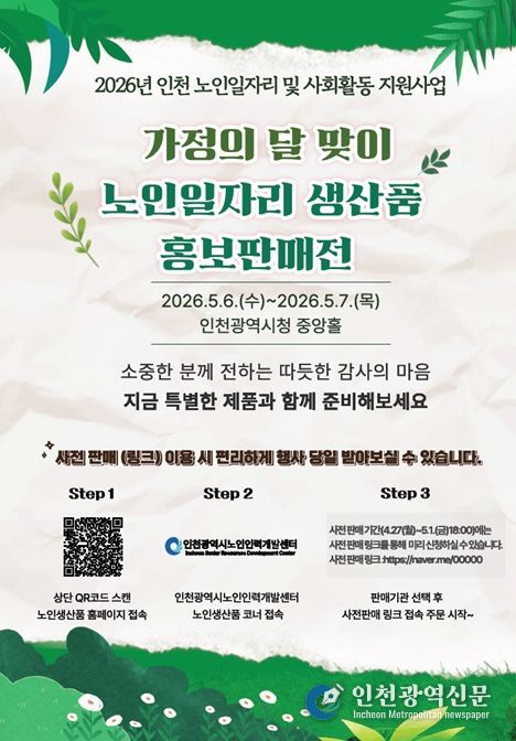 [인천광역신문] 최예준 기자 | 인천시가 2026년 노인일자리 사업을 대폭 확대하고, 5월 가정의 달을 맞아 어르신들이 직접 제작한 생산품을 시민들에게 선보이는 홍보·판매 행사를 개최한다.