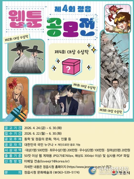 [인천광역신문] 최예준 기자 | 정읍시가 지역의 가치를 발굴하고 창의적인 홍보 자료를 확보하기 위해 ‘제4회 정읍 웹툰 공모전’을 개최한다.
