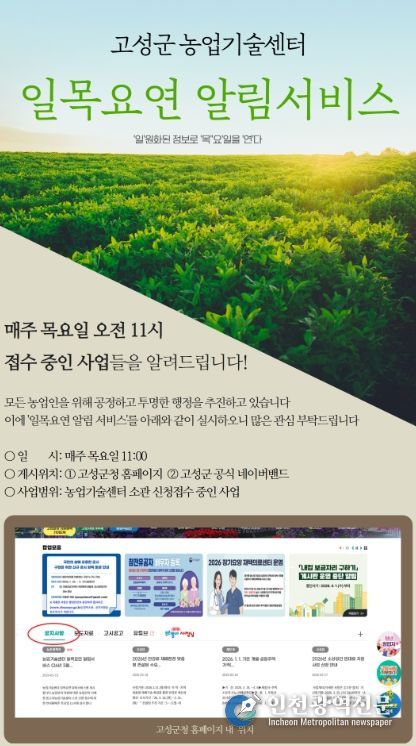 [인천광역신문] 최예준 기자 | 고성군 농업기술센터는 농업 관련 보조사업과 신청사업 정보를 한눈에 확인할 수 있는 '일목요연 알림 서비스'를 올해 3월 19일부터 운영하고 있다고 밝혔다.