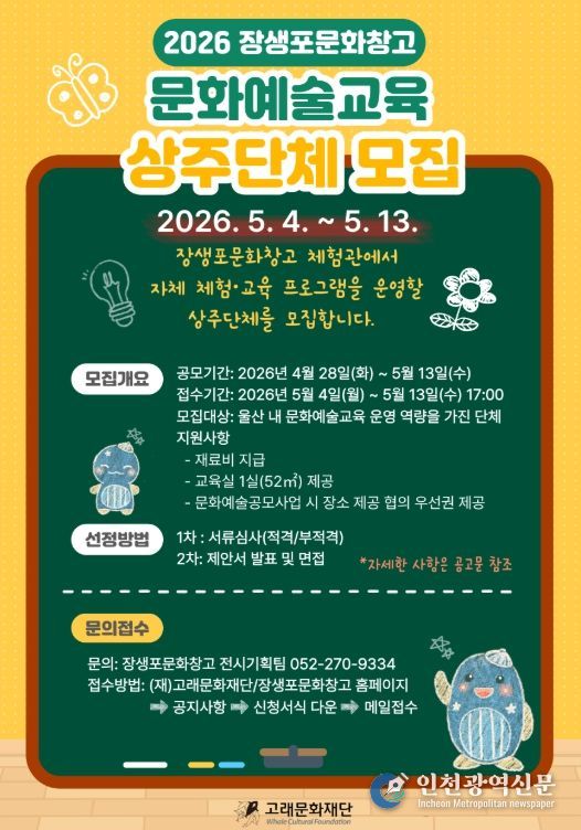 [인천광역신문] 최예준 기자 | (재)고래문화재단이 운영하는 장생포문화창고는 어린이와 시민들에게 예술 체험을 선물할 ‘문화예술교육 상주단체’를 모집한다고 28일 밝혔다.