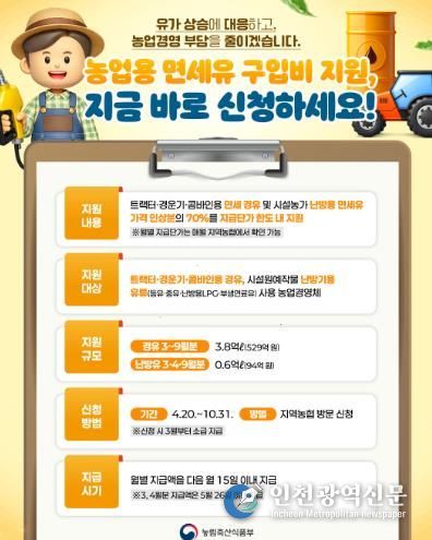[인천광역신문] 최예준 기자 | 농림축산식품부는 최근 중동 지역 정세 불안으로 인한 국제유가 상승에 대응하기 위하여 농업인의 유류비 부담을 완화, 농가 경영 안정을 지원하기 위해 '농업용 면세유 유가연동 보조금 지원사업'을 추진한다고 밝혔다.