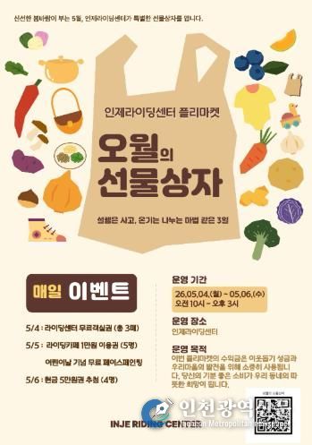 [인천광역신문] 최예준 기자 | 인제라이딩센터가 5월 가정의 달을 맞아 지역 주민과 함께하는 따뜻한 나눔의 장, ‘오월의 선물상자 인제라이딩센터 플리마켓’을 개최한다.