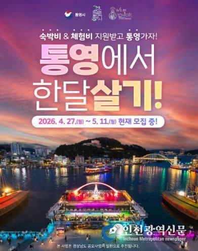 [인천광역신문] 최예준 기자 | 통영시는 체류형 관광 활성화와 지역 경제 활성화를 위해 ‘통영애(愛)온나(2026년 경남에서 한 달 여행하기)’사업 1차 참가자를 오는 5월 11일까지 모집한다.