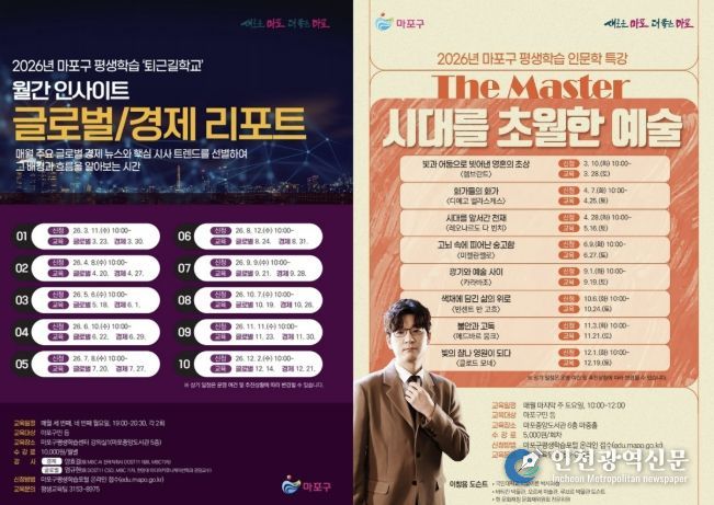 [인천광역신문] 최예준 기자 | 마포구는 마포구평생학습센터(성산로 128)를 중심으로 평생교육 프로그램 ‘365클래스’와 ‘퇴근길학교’를 운영해 구민의 자기계발과 평생학습 참여 기회를 넓히고 있다.