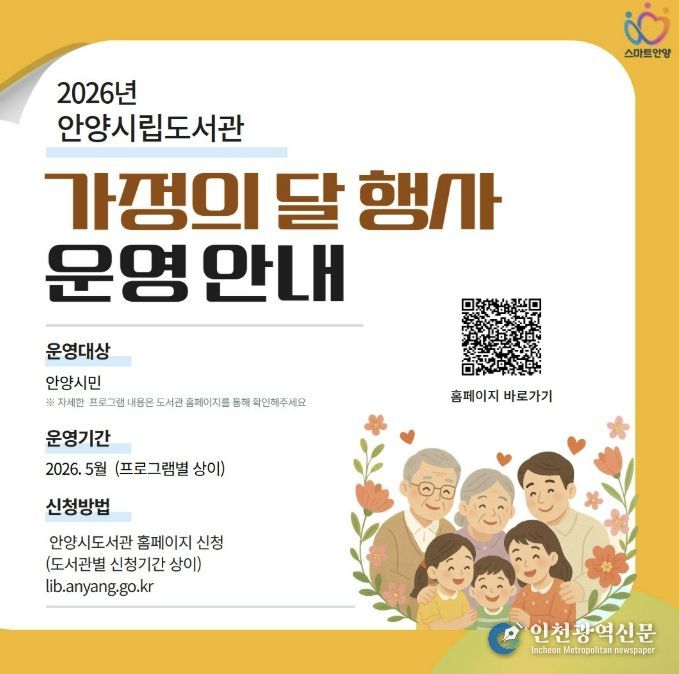 [인천광역신문] 최예준 기자 | 안양시도서관은 5월 가정의 달을 맞아 어린이와 부모가 함께하는 체험프로그램, 가족공연, 인문학 강연, 생활문화 강좌, 전시 등 다양한 행사를 마련했다.