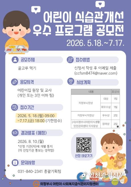 [인천광역신문] 최예준 기자 | 의정부시가 운영하는 의정부시 어린이‧사회복지급식관리지원센터는 어린이 보육시설을 대상으로 5월 18일부터 7월 17일까지 ‘어린이 식습관 개선 우수 프로그램 공모전’을 개최한다.