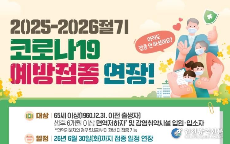 [인천광역신문] 최예준 기자 | 남원시보건소는 여름철 코로나19 재확산에 대응하기 위해 ‘2025-2026절기 코로나19 예방접종’ 기간을 당초 4월 30일에서 6월 30일까지 두 달간 연장한다고 밝혔다.