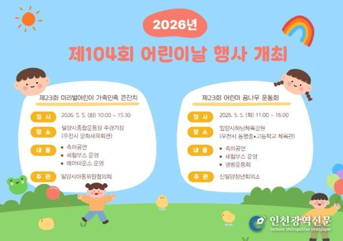 [인천광역신문] 최예준 기자 | 경남 밀양시가 제104회 어린이날을 맞아 아이들에게는 꿈과 희망을, 가족에게는 따뜻한 추억을 선물할 다채로운 축제의 장을 마련한다.