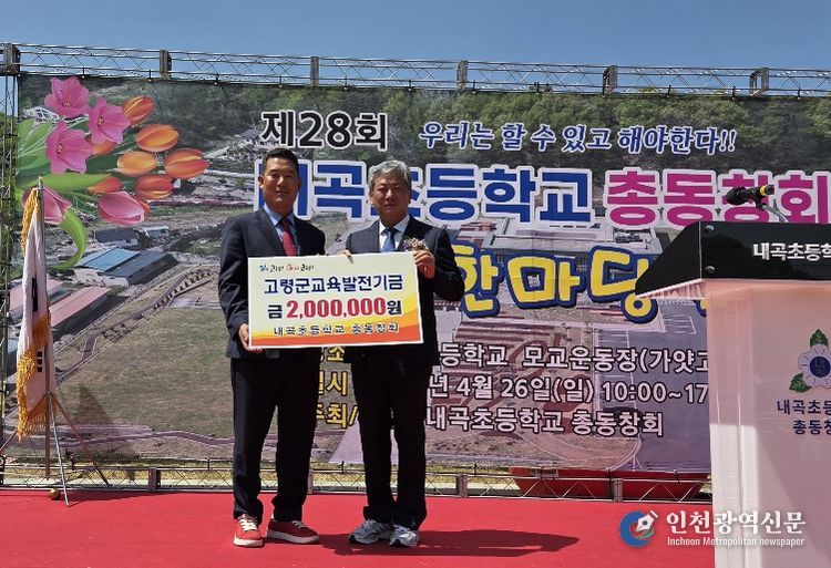 [인천광역신문] 최예준 기자 | 내곡초등학교 총동창회(회장 문수열)에서 4월 26일(일) 가얏고 정원에서 개최된 ‘제28회 내곡초등학교총동문회 화합한마당축제’에서 지역의 교육 발전과 인재 양성을 위해 사용해 달라며 지난해에 이어 교육발전기금 200만원을 기탁했다.