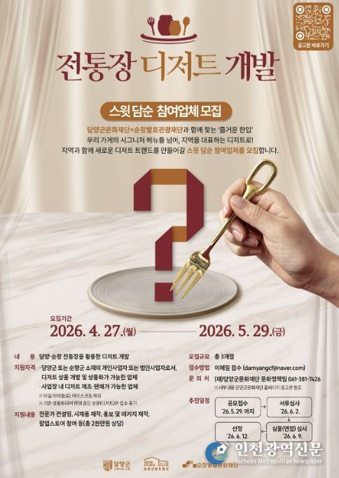 [인천광역신문] 최예준 기자 | 담양군문화재단이 순창발효관광재단과 함께 지역 전통장을 활용한 디저트 개발 프로젝트 ‘스윗 담순’ 참여업체를 모집한다.
