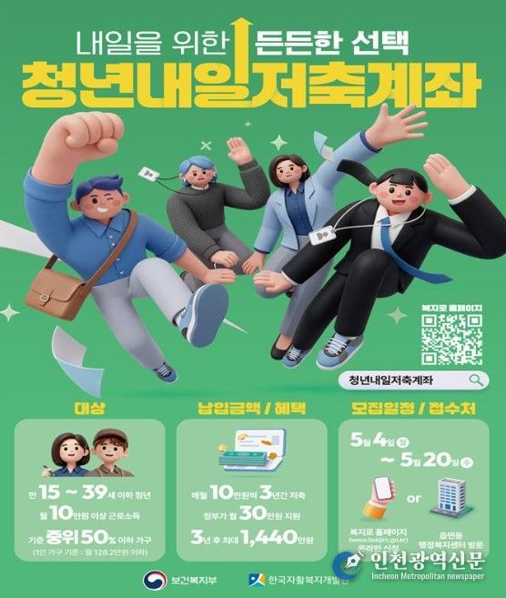 [인천광역신문] 최예준 기자 | 서귀포시는 일하는 저소득 청년의 자립기반 마련을 지원하기 위해 5월 4일부터 5월 20일까지 ‘청년내일저축계좌’ 신규가입자를 모집한다.