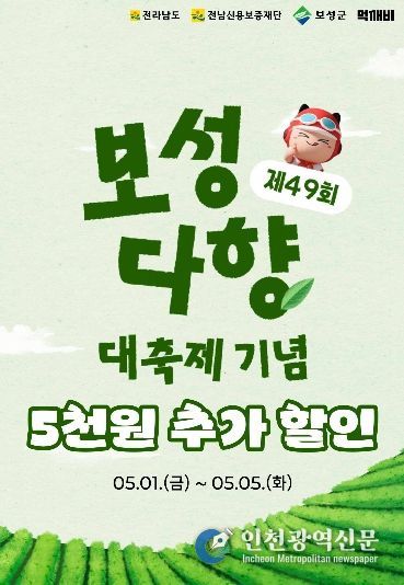[인천광역신문] 최예준 기자 | 보성군은 제49회 보성다향대축제를 맞아 5월 1일부터 5일간 공공배달앱 ‘먹깨비’를 활용한 추가 할인 행사를 진행한다고 밝혔다.