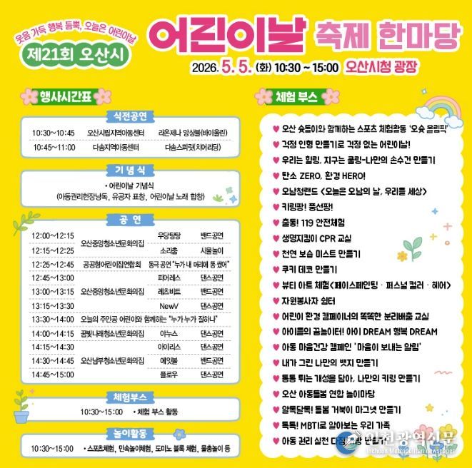 [인천광역신문] 최예준 기자 | 오산시는 오는 5월 5일 어린이날을 맞아 오산시청 광장에서 ‘제21회 오산시 어린이날 축제 한마당’을 개최한다고 밝혔다.
