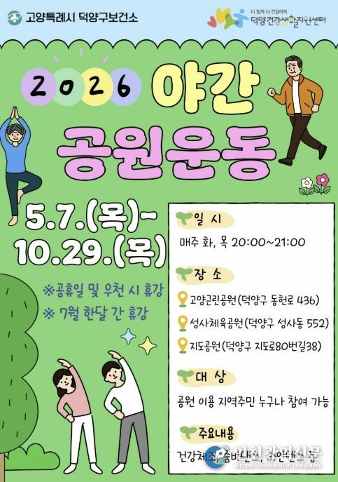 [인천광역신문] 최예준 기자 | 고양특례시 덕양구보건소는 오는 5월 7일부터 야간공원 운동교실을 운영한다.