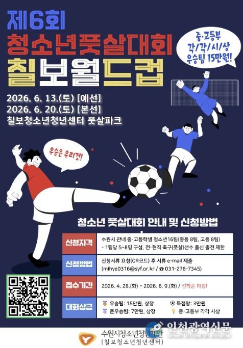 [인천광역신문] 최예준 기자 | 수원시청소년청년재단 칠보청소년청년센터는 오는 6월 13일(예선)과 20일(본선), 양일간 센터 내 풋살파크에서 녪. 청소년 풋살대회 [제6회 칠보월드컵]’을 개최한다고 밝혔다.