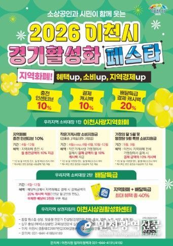 한편, 이천시에서 연말까지 진행하고 있는 ‘2026 이천시 경기활성화 페스타’의 주요 혜택 내용은 ➀지역화폐 충전 시 인센티브 10% 지급(월10만 원 한도) ➁작은가게(연매출 3억 원 이하 가맹점)에서 결제 시 10% 캐시백 지급[월 10만 원 한도 / 5월(가정의 달), 9월(추석달)은 전체 가맹점에서 결제 캐시백 혜택] ➂배달특급에서 지역화폐 결제 시 추가 20% 캐시백 지급 혜택(월 2만 원 한도) 등이 있으며, 배달특급에서 지역화폐로 결제할 경우 최대 40%까지 할인되는 놀라운 혜택을 볼 수 있다.
