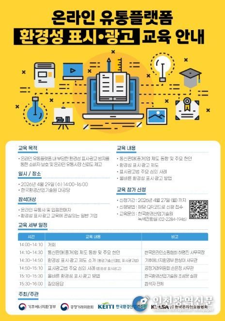 [인천광역신문] 최예준 기자 | 공정거래위원회와 기후에너지환경부는 4월 29일 한국환경산업기술원 대강당(서울 은평구 소재)에서 온라인 유통사를 대상으로 ‘환경성 표시·광고 교육’을 개최한다고 밝혔다.