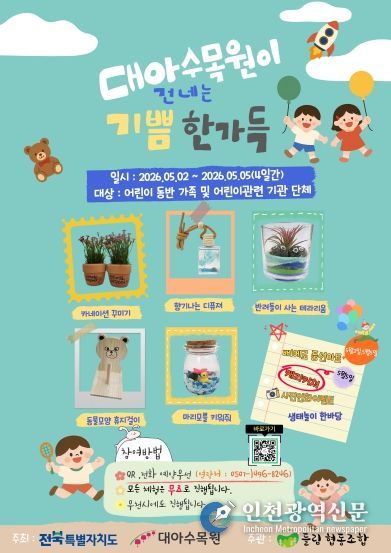 [인천광역신문] 최예준 기자 | 전북특별자치도는 대아수목원이 제104회 어린이날을 맞아 5월 2일부터 5일까지 어린이와 가족이 함께 즐길 수 있는 특별행사를 운영한다고 28일 밝혔다.