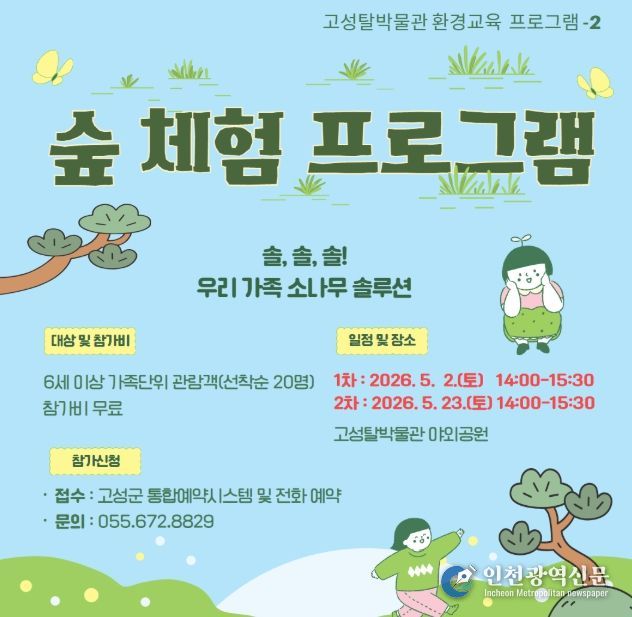[인천광역신문] 최예준 기자 | 고성탈박물관은 오는 5월 2일과 23일 오후 2시부터 가족 관람객 20명을 대상으로 숲 체험 프로그램을 운영한다.