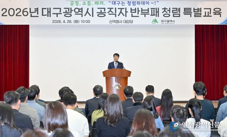 [인천광역신문] 최예준 기자 | 대구광역시는 4월 28일 산격청사 대강당에서 김정기 대구시장 권한대행을 비롯한 고위공직자 및 신규·승진 공무원 등 200여 명이 참석한 가운데 ‘2026년 반부패·청렴 특별교육 및 청렴 결의대회’를 개최했다.