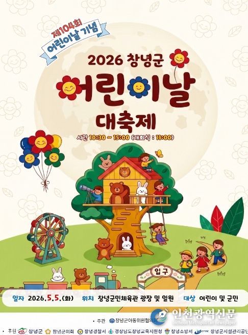 [인천광역신문] 최예준 기자 | 창녕군아동위원협의회는 오는 5월 5일 제104회 어린이날을 맞아 지역 어린이와 가족이 함께 즐길 수 있는 ‘2026년 창녕군 어린이날 대축제’를 창녕군민체육관 광장에서 개최한다고 밝혔다.