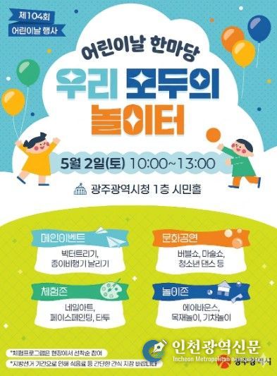 [인천광역신문] 최예준 기자 | 광주광역시는 어린이날을 기념해 오는 5월 2일 오전 10시부터 오후 1시까지 시청 1층 시민홀에서 특별행사를 연다.