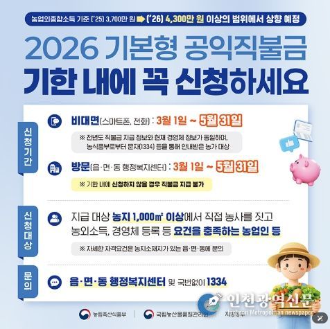 [인천광역신문] 최예준 기자 | 2026 기본형 공익직불금 기한 내에 꼭 신청하세요.