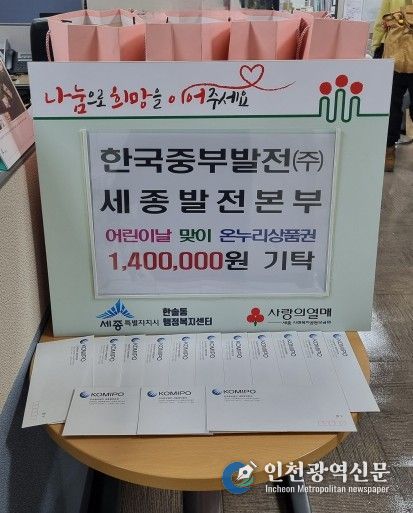 [인천광역신문] 최예준 기자 | 세종특별자치시 한솔동지역사회보장협의체가 28일 한국중부발전㈜ 세종발전본부로부터 140만 원 상당의 온누리상품권을 기탁받았다.
