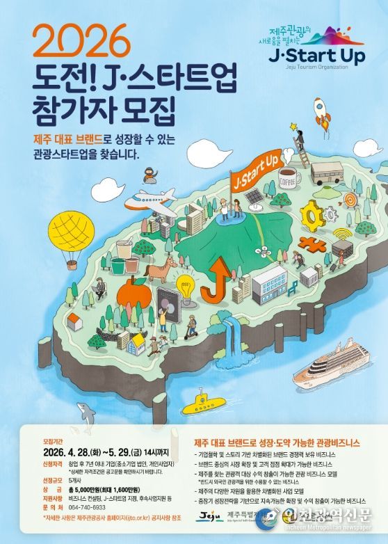 [인천광역신문] 최예준 기자 | 제주특별자치도와 제주관광공사(사장 고승철)는 오는 5월 29일까지 온라인 채널을 통해 제주 관광산업 혁신을 선도할 유망 기업을 발굴하고 육성하기 위해 ‘2026 도전! J-스타트업’ 참가기업을 모집하고 있다고 28일 밝혔다.