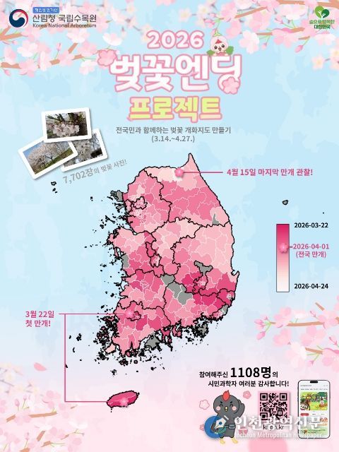 [인천광역신문] 최예준 기자 | 산림청 국립수목원(원장 임영석)은 2026년 봄, 시민과학 참여 프로그램 '벚꽃엔딩 프로젝트'를 통해 국민과 함께 전국 벚나무 개화 현황을 기록하고, 이를 지도 형태로 시각화한 ‘전국 벚꽃 개화지도’를 공개했다고 밝혔다.