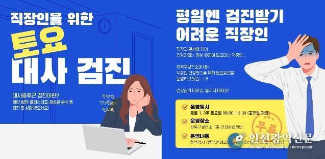 [인천광역신문] 최예준 기자 | 서울 강북구 보건소 건강관리센터가 평일에 시간을 내기 어려운 직장인들의 건강 회복을 위해 ‘직장인 맞춤형 토요 대사증후군 검진 서비스’를 운영하며 구민 건강권 확보에 나섰다.