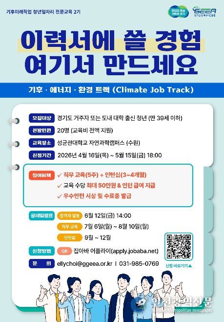 [인천광역신문] 최예준 기자 | 경기도와 경기환경에너지진흥원은 도내 기후·에너지·환경 분야 기업 취업을 희망하는 청년을 대상으로 ‘기후미래직업 청년일자리 전문과정’에 참여할 교육생 20명을 5월 15일까지 모집한다.
