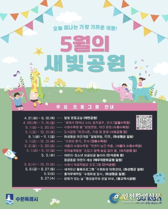 수원시 관계자는 “가정의 달 5월을 맞아 시민들이 가까운 공원에서 자연과 문화를 함께 즐길 수 있도록 다양한 프로그램을 준비했다”며 “전 세대가 함께 누릴 수 있는 공원 중심 문화 콘텐츠를 확대해 나가겠다”고 말했다.