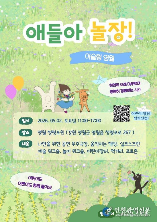 [인천광역신문] 최예준 기자 | 영월군은 5월 첫째 주 어린이날 연휴를 맞아 어슬렁영월 마켓 '애들아 놀장' 행사를 오는 5월 2일 오전 11시부터 오후 5시까지 청령포원에서 개최한다.