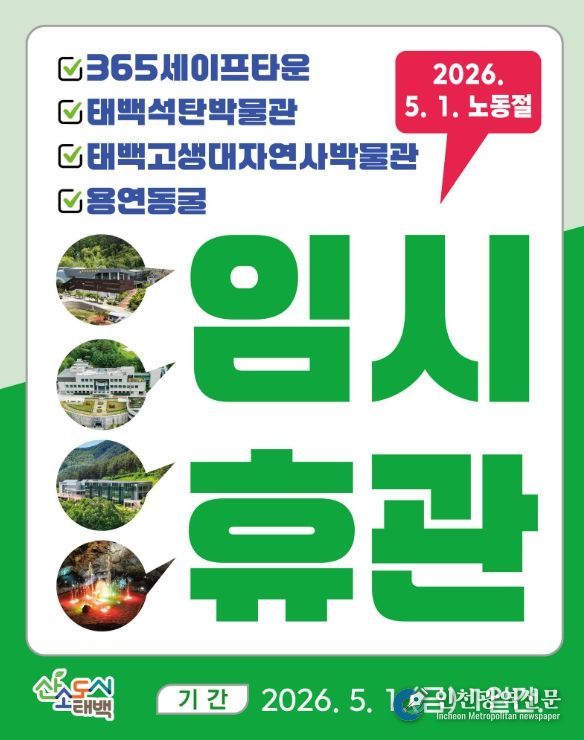 [인천광역신문] 최예준 기자 | 태백시는 오는 5월 1일 근로자의 날을 맞아 관내 주요 관광시설에 대해 임시 휴관을 실시한다고 밝혔다.