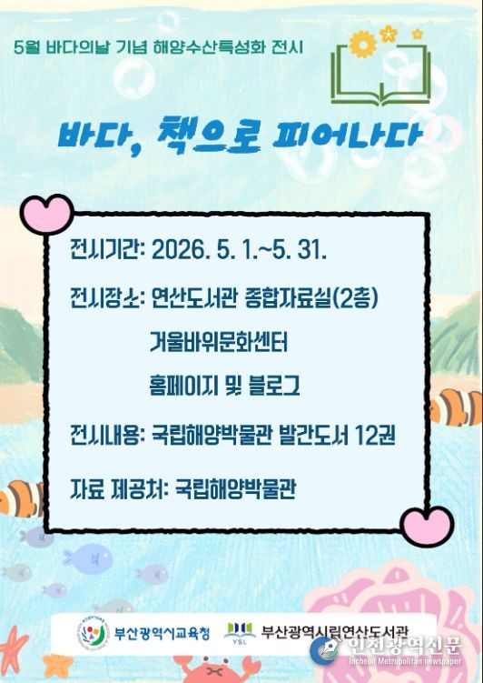[인천광역신문] 최예준 기자 | 부산광역시립연산도서관은 바다의 날(5월 31일)을 기념해 5월 한 달간 지역주민과 도서관 이용자를 대상으로 해양·수산 특성화 전시 ‘바다, 책으로 피어나다’를 운영한다.