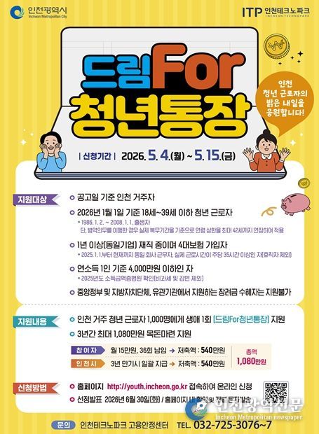 [인천광역신문] 최예준 기자 | 인천광역시는 청년들이 안정적으로 미래를 설계하고 목돈을 마련할 수 있도록 지원하는 ‘드림For청년통장’ 사업 참여자를 오는 5월 4일부터 15일까지 모집한다고 밝혔다.