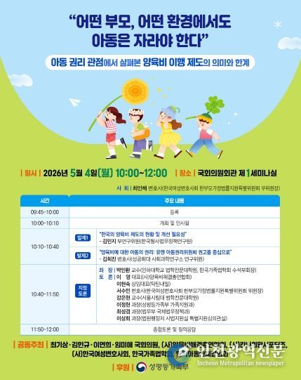 어린이날을 하루 앞두고 개최되는 이번 토론회는 아동권리의 관점에서 양육비 제도의 이행 현황과 개선점을 논의하는 자리로, 4인의 국회의원과 (사)양육비해결총연합회, (사)칸나희망서포터즈, (사)한국여성변호사회, 한국가족법학회, 한국아동단체협의회가 공동주최하고, 성평등가족부가 후원 기관으로 참여한다.
