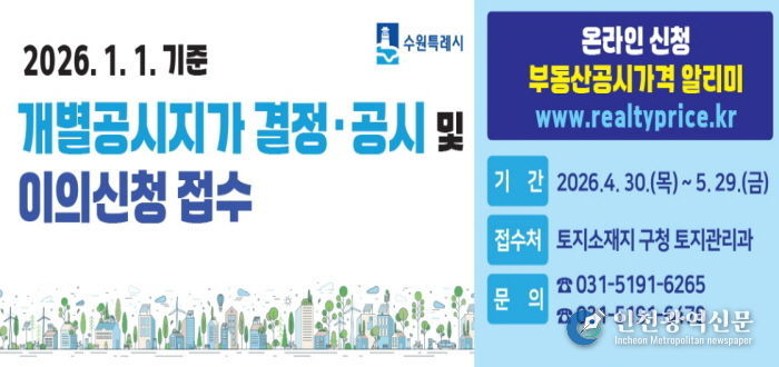 [인천광역신문] 최예준 기자 | 수원시 권선구는 4월 30일 결정·공시되는 개별공시지가에 대해 4월 30일부터 5월 29일까지 이의신청을 접수한다고 밝혔다.