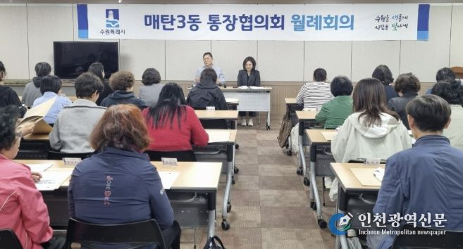 [인천광역신문] 최예준 기자 | 수원시 영통구 매탄3동은 지난 28일 시정 및 동정 소식 공유를 위해 4월 2차 통장협의회 월례회의를 개최했다.