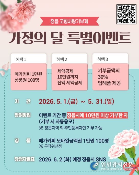 시는 이벤트 기간 기부자 가운데 100명을 무작위로 추첨해 1만원 상당의 메가커피 상품권을 증정할 예정이다. 당첨자는 6월 2일 정읍시 공식 누리소통망(SNS)을 통해 발표된다.