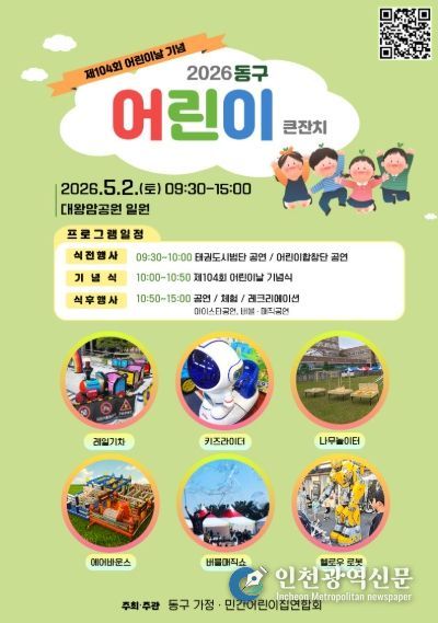 [인천광역신문] 최예준 기자 | 동구 가정·민간어린이집연합회(회장 전수경·서은원)는 5월 2일 오전 9시 30분부터 오후 3시까지 대왕암공원 일원에서 제104회 어린이날 기념 동구 어린이 큰잔치 행사를 개최한다.
