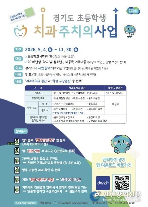 [인천광역신문] 최예준 기자 | 의왕시 보건소가 오는 5월 4일부터 11월 30일까지 ‘2026년 경기도 초등학생 치과주치의사업’을 시행한다.