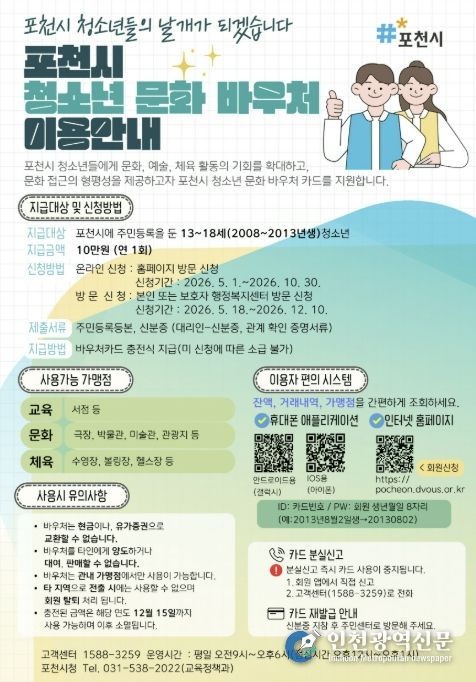 [인천광역신문] 최예준 기자 | 포천시는 청소년의 문화 접근성을 높이고 다양한 체험 기회를 제공하기 위해 ‘포천시 청소년 문화 바우처 지원사업’을 본격 시행한다.